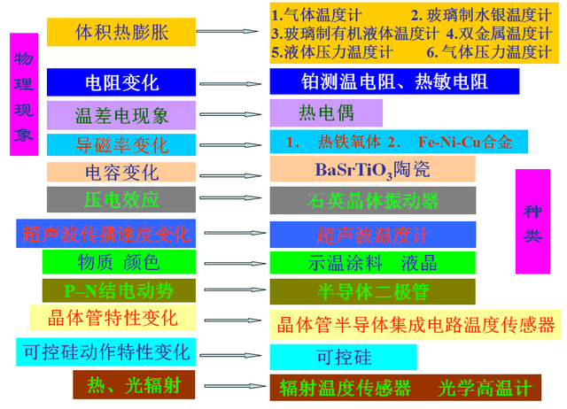 隨物體的熱膨脹相對變化而引起的體積變化; 蒸氣壓的溫度變化; 電極的溫度變化 熱電偶產(chǎn)生的電動(dòng)勢; 光電效應(yīng) 熱電效應(yīng) 介電常數(shù)、導(dǎo)磁率的溫度變化; 物質(zhì)的變色、融解; 強(qiáng)性振動(dòng)溫度變化; 熱放射; 熱噪聲。