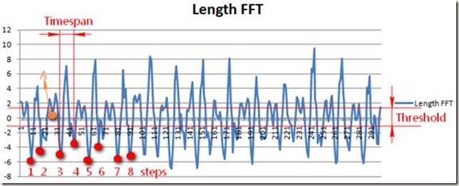 人體最快的跑步頻率為5HZ,也就是說相鄰兩步的時(shí)間間隔的至少大于0.2秒,如圖所示,我們設(shè)置了timespan在記步過程中我們過濾了高頻噪聲,即步頻過快的情況。同時(shí)我們通過和上次加速度大小進(jìn)行比較,設(shè)置設(shè)立一定的閥值Threshold來判斷運(yùn)動是否屬于有效,有效運(yùn)動才可進(jìn)行記步。