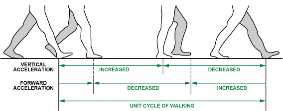 用戶在水平步行運(yùn)動中,垂直和前進(jìn)兩個(gè)加速度會呈現(xiàn)周期性變化,如圖所示。在步行收腳的動作中,由于重心向上單只腳觸地,垂直方向加速度是呈正向增加的趨勢,之后繼續(xù)向前,重心下移兩腳觸底,加速度相反。水平加速度在收腳時(shí)減小,在邁步時(shí)增加。