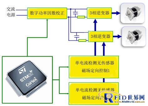 圖1:STM32F103HD可以同時處理雙電機控制和數(shù)字PF