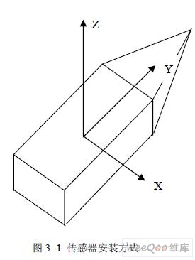 在本系統(tǒng)中,三軸加速度計和三軸 MR 傳感器都以以下的方式安裝于電路板上:它們 的X 軸平行于系統(tǒng)的橫軸指向右,Y 軸平行于系統(tǒng)的縱軸指向前,X、Y、Z 軸定義為右手 坐標(biāo)系統(tǒng),如圖3 -1 所示。
