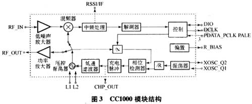 CC1000 工作頻帶為315MHz,868MHz,915MHz,具有低電壓、低功耗、可編程輸出功率、高靈敏度、小尺寸、集成了位同步器等特點(diǎn)。其FSK數(shù)傳可達(dá) 72.8Kbit/s。具有250Hz步長可編程頻率能力,適用于跳頻協(xié)議,主要工作參數(shù)能通過串行總線接口編程改變,使用非常靈活,圖3為CC1000 的模塊結(jié)構(gòu)圖。