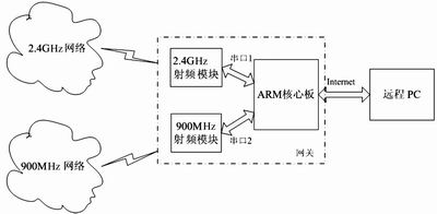 網(wǎng)關(guān)機硬件采用基于ARM7TDMI的嵌入式系統(tǒng)開發(fā)板,外加兩個基于RFW-D100和102以及nRF905的無線射頻模塊。其結(jié)構(gòu)示意圖見圖1的中間部分。這樣設(shè)計的主要考慮是節(jié)約開發(fā)時間。兩個射頻模塊子板和ARM板之間通過串口通信。