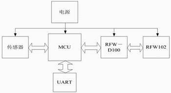 硬件部分如圖2所示,包括電源、MCU、傳感器、RFW-D100和102。其中MCU是主要控制器件,傳感器設(shè)計成可分離式,可以插多種傳感器。RFW-D100和102聯(lián)合組成射頻部分,完成無線數(shù)據(jù)收發(fā)。UART可以在調(diào)試硬件時使用,在板子作為網(wǎng)關(guān)機的射頻模塊時,UART完成與ARM板的通信。電源設(shè)計成電池和外接電源兩種供電方式。