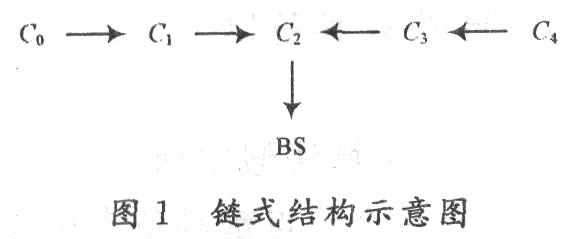 當(dāng)節(jié)點鏈形成并且選舉出領(lǐng)導(dǎo)節(jié)點后,就開始了數(shù)據(jù)傳輸過程。PEGASIS中的數(shù)據(jù)傳輸使用Token(令牌)機(jī)制,如圖1所示。Token很小,故能耗較少。在一輪通信中,領(lǐng)導(dǎo)節(jié)點用Token控制數(shù)據(jù)從鏈尾開始傳輸。圖中,C2為領(lǐng)導(dǎo)節(jié)點,將Token沿著鏈傳給C0,Co傳數(shù)據(jù)給C1,C1將C0數(shù)據(jù)和自身數(shù)據(jù)進(jìn)行融合后形成一個相同長度的數(shù)據(jù)包,再傳給C2.然后,C2將Token傳給C4,C2以相同的方式接收來自C3,C4的數(shù)據(jù)。這些數(shù)據(jù)在C2處進(jìn)行融合后,發(fā)給基站。