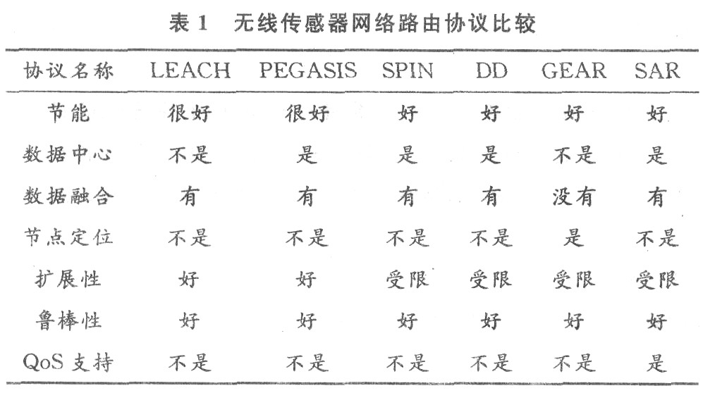節(jié)能是無線傳感器網(wǎng)絡(luò)最重要的特征,因而高效地利用能量是無限傳感器網(wǎng)絡(luò)路由協(xié)議設(shè)計的根本出發(fā)點。LEACH和PEGASIS具備很好的節(jié)能策略,SPIN,DD,GEAR,SAR也分別具備相應(yīng)的節(jié)能策略。但是,無線傳感器網(wǎng)絡(luò)與應(yīng)用高度相關(guān),所以路由協(xié)議在節(jié)能的前提下還要滿足以下方面的性能要求:以數(shù)據(jù)為中心、支持?jǐn)?shù)據(jù)融合、基于節(jié)點定位、具有可擴(kuò)展性、魯棒性、提供QoS支持等。依據(jù)上述性能指標(biāo),對描述的路由協(xié)議特點進(jìn)行對比的結(jié)果如表1所示。