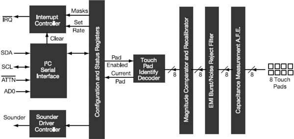 當物體(例如我們高度絕緣和導電的身體上的一個手指)靠近金屬電極時,就形成了一條電路徑,從而導致電場電流發(fā)生變化。正常情況下,傳感器測量產(chǎn)生電的電場中的AC阻抗,并且將將測量轉(zhuǎn)化成DC輸出電壓。帶有模數(shù)控制器(ADC)的外部微控制器然后會處理這個信息,以執(zhí)行任意數(shù)量的功能,例如與觸摸板控制面板相關(guān)的功能。但是,我們更先進的MPR083和MPR084近接電容式觸摸傳感器控制器則通過帶定制尋址的內(nèi)置集成電路(I2C)生成數(shù)字輸出,因此不需要外部ADC。