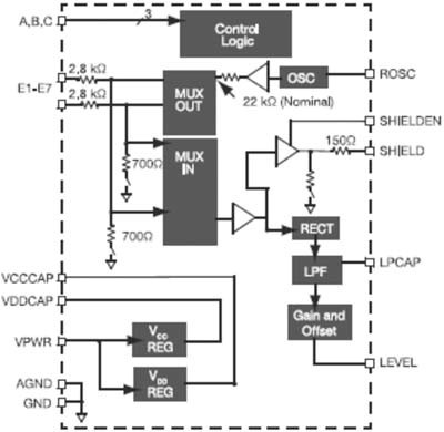 在近接電容式傳感器中,飛思卡爾使用了多種技術(shù)。MC33794、MC33941和MC34940產(chǎn)品系列在傳感器集成電路(IC)中包含振蕩器電路,以生成高純度、低頻率5V正弦波,并由39000歐姆負載電阻器進行調(diào)節(jié)。這個AC信號被饋入復用器里,復用器然后將信號定向傳輸?shù)竭x定的電極/參考引腳或內(nèi)部測量節(jié)點上。IC自動把未選的節(jié)點連接到電路接地中,充當創(chuàng)建電場電流所需的返回路徑。