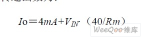 濕度傳感器輸出的0~3V 電壓通過(guò)XTR105 芯片的2 和13 引腳輸入。調(diào)整3 和4 引腳間的電阻RG和RG1 的值,可以改變XTR105 芯片的內(nèi)置儀表放大器增益值,從而選定合適的測(cè)量范圍。RCM 取為1KO,它提供一個(gè)附加電壓降,使XTR105 的輸入電壓限制在共模方式下的電壓范圍內(nèi)。與RCM 并聯(lián)的0.01μF 旁路電容用于降低共模噪聲。整個(gè)裝置的電壓,電流傳遞函數(shù)為: