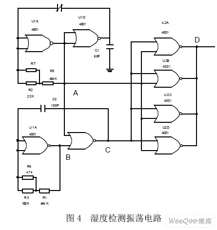 需要指出的是,圖3 所示的濕度傳感器零點(diǎn)電容比較大,靈敏度不夠高,濕度從0%~100%RH,電容的變化量不超過(guò)30~50PF。為此,最好將零點(diǎn)電容消除掉,在實(shí)際設(shè)計(jì)中我們用兩片CMOS4001 集成電路對(duì)圖3 進(jìn)行改造,具體見(jiàn)圖4。