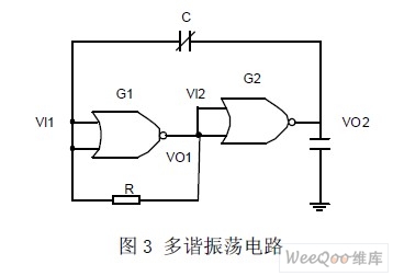 振蕩電路的作用是將電容的變化量轉(zhuǎn)化為頻率可變的方波。由圖3 可知,這是一個(gè)非對(duì)稱多諧振蕩器。或非門G1 工作在電壓傳輸特性的轉(zhuǎn)折區(qū),把它的輸出電壓直接連接到或非門G2 的輸入端。G2即可得到一個(gè)介于高低電平之間的靜態(tài)偏置電壓,從而使G2 的靜態(tài)工作點(diǎn)也處于電壓傳輸特性轉(zhuǎn)折區(qū)上。反饋環(huán)路中電容使電路在兩個(gè)暫穩(wěn)態(tài)之間往復(fù)振蕩。
