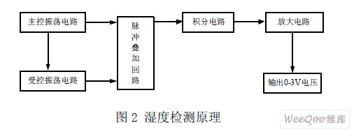 HS1101在電路中相當(dāng)于一個(gè)電容器件,它的電容量隨著所測(cè)空氣濕度的增加而增大,為了能將電容的變化轉(zhuǎn)換成電壓的變化,我們?cè)O(shè)計(jì)了振蕩電路、消除零點(diǎn)電容影響電路、整流電路、積分電路、電壓—電流轉(zhuǎn)換電路、放大電路等,其工作原理簡(jiǎn)圖如圖2 所示。