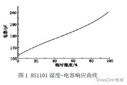 目前, 生產(chǎn)濕敏電容的主要廠家是法國(guó)Humirel 公司。它生產(chǎn)的HS1101 測(cè)量范圍是0%~100%RH,電容量由162PF 變到200PF,其誤差不大于±2%RH;響應(yīng)時(shí)間小于5S;濕度系數(shù)為0.34PF/℃;年漂移量0.5%RH/年,長(zhǎng)期穩(wěn)定。圖1 為HS1101 濕敏電容的濕度-電容響應(yīng)曲線。