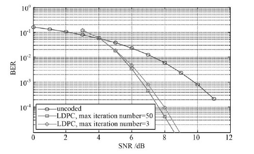 由圖3可知,LDPC硬解碼方案可以大幅改善信號(hào)抗噪聲性能,而通過解碼迭代次數(shù)的對(duì)比,發(fā)現(xiàn)迭代3次效果已經(jīng)相當(dāng)理想,而迭代50次并不能大幅提高解碼效果。
