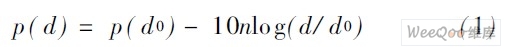 RSSI 是最基本的測距方法,基本不需要額外的硬件設(shè)備,實(shí)現(xiàn)方法簡單。在基于接收信號強(qiáng)度指示RSSI的測距中,已知發(fā)射節(jié)點(diǎn)的發(fā)射信號強(qiáng)度,接收節(jié)點(diǎn)根據(jù)收到的信號強(qiáng)度計算出信號的傳播損耗,利用理論和經(jīng)驗(yàn)?zāi)P蛯鬏敁p耗轉(zhuǎn)化為節(jié)點(diǎn)間的距離。其理論模型為: