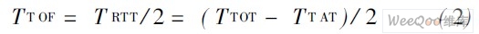 A 節(jié)點(diǎn)測量出從發(fā)送數(shù)據(jù)包到接收確認(rèn)的時間,這段消耗總時間記為TT OT 時間; B 記錄了B 從收到數(shù)據(jù)包到B 回應(yīng)確認(rèn)消息的這個時間段的時間,記為TT AT 。用T TOT 總時間減去周轉(zhuǎn)時間TT AT 就是雙方的數(shù)據(jù)包在飛行中度過的往返時間,記為TRTT 時間。假定在每個方向發(fā)生的飛行時間TTO F 等于50% 的往返時間,如式( 2) 所示:
