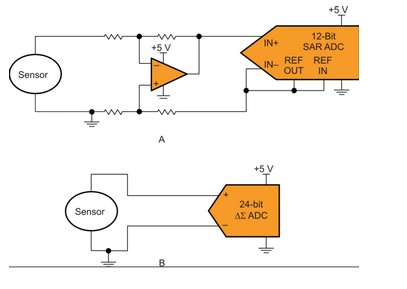 一個 24 位 Δ-Σ (B) 顯示了一個直接連接至轉(zhuǎn)換器的傳感器。