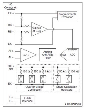 NI PXIe-4330含有專為橋式測量優(yōu)化的硬件設(shè)計。因此,模塊并不適于純電壓測量。
