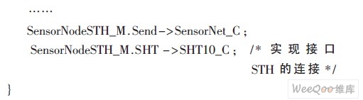 溫濕度傳感器節(jié)點(diǎn)的組件連接如圖2 所示。小矩形框內(nèi)是各組件使用和提供的接口, 箭頭方向表示命令調(diào)用的方向。因?yàn)樗袀鞲衅鞴?jié)點(diǎn)都具有定時(shí)采樣、數(shù)據(jù)處理、按協(xié)議數(shù)據(jù)收發(fā)、射頻模塊和MCU 電源管理等功能, 所以這里將與傳感器有關(guān)的操作單獨(dú)設(shè)計(jì)一個(gè)組件SHT10_C, 在頂層配件中通過(guò)與不同類(lèi)型傳感器組件連接, 實(shí)現(xiàn)各傳感器節(jié)點(diǎn)功能。將與傳感器操作無(wú)關(guān)、與應(yīng)用相關(guān)的其他功能組合設(shè)計(jì)一個(gè)中間組件SensorNet_C,通過(guò)與下層配件McuSleepC、CsmaC 和CC2430ActiveMessageC連接, 實(shí)現(xiàn)MCU 電源管理、CSMA 協(xié)議及射頻模塊控制。配件SHT10_C 和SensorNet_C 僅提供組件間連接關(guān)系, 其實(shí)現(xiàn)分別由SHT10_M 和SensorNet_M 完成。在調(diào)用命令Send.send () 發(fā)送數(shù)據(jù)時(shí), 首先進(jìn)行清潔信道*估, 如果信道被占用, 則需要退避一段時(shí)間。退避時(shí)間由隨機(jī)函數(shù)產(chǎn)生一個(gè)1~31 之間的隨機(jī)數(shù), 與一個(gè)給定初始值(這里設(shè)為160 μs , 即10 symbols) 相乘而得。初始值可以根據(jù)網(wǎng)絡(luò)中節(jié)點(diǎn)數(shù)量進(jìn)行調(diào)整, 節(jié)點(diǎn)少則初始值小, 反之則適當(dāng)加大。溫濕度傳感器節(jié)點(diǎn)的頂層配置組件程序如下: