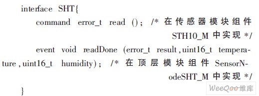 溫濕度傳感器SHT10 具有兩線制串行接口, 輸出已校準(zhǔn)數(shù)字信號(hào)。這里定義SHT10 的接口SHT 如下, 需要在模塊組件SHT10_M 中實(shí)現(xiàn)接口所定義的命令。