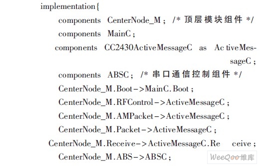 在配件SensorNet_C 中, 通過(guò)連接配件CC2430ActiveMessageC使用模塊組件CC2430ActiveMessageP 中提供的射頻功能。CC2430ActiveMessageP 是射頻堆棧中的頂層組件, 提供單跳通信實(shí)現(xiàn)方法。通過(guò)連接配件McuSleepC使用模塊組件McuSleepP 中的MCU 電源管理功能, 實(shí)現(xiàn)MCU 睡眠、定時(shí)和啟動(dòng)等功能, 以降低節(jié)點(diǎn)功耗。需要在使用McuSleepP 組件的上層組件SensorNet_M 中實(shí)現(xiàn)事件McuSleepControl.beforeSleep () 和McuSleepControl.after-Wakeup() , 以保護(hù)和恢復(fù)睡眠前后的狀態(tài)。