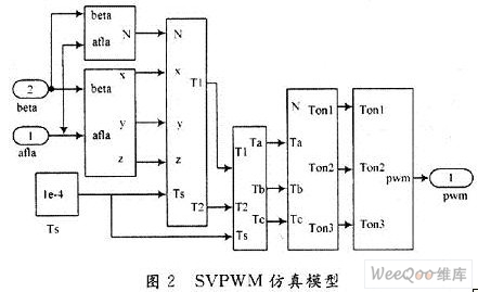 異步電機無速度傳感器矢量控制系統(tǒng)如圖1所示,主要包括三相異步電機模塊,SVPWM模塊,PI模塊,坐標(biāo)變換模塊,轉(zhuǎn)子磁鏈估算模塊,轉(zhuǎn)子轉(zhuǎn)速估算模塊,逆變器模塊等。該系統(tǒng)主電路采用SVPWM調(diào)制逆變器,控制電路中,給定轉(zhuǎn)速與估算轉(zhuǎn)速經(jīng)過速度調(diào)節(jié)器得到轉(zhuǎn)矩,與估算磁鏈值計算得到電流isq,經(jīng)過電流調(diào)節(jié)器,再經(jīng)過PARK逆變換得到兩相靜止電壓,經(jīng)過SVPWM調(diào)制,控制逆變器電壓輸出,進(jìn)而控制三相異步電機。SVPwM控制的基本思想是將電機與逆變器看成一個整體,最終在電機內(nèi)部形成圓形磁場,以達(dá)到更好的控制效果,SVPWM控制的仿真模型如圖2所示。