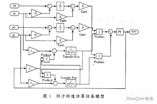 對于高性能的磁場定向控制系統(tǒng),速度閉環(huán)是必不可少的,轉(zhuǎn)速閉環(huán)需要實時的電機轉(zhuǎn)速,目前速度反饋量的檢測多是采用光電脈沖編碼器、旋轉(zhuǎn)變壓器或測速發(fā)電機。但是,許多場合下不允許安裝任何速度傳感器,此外安裝速度傳感器在一定程度上降低了系統(tǒng)的可靠性。因此,無速度傳感器控制的高性能通用變頻器是當(dāng)前全世界自動化技術(shù)和節(jié)能應(yīng)用中受到普遍關(guān)心的產(chǎn)品和開發(fā)課題。無速度傳感器磁場定向矢量控制技術(shù)的核心是如何準(zhǔn)確的獲取磁場定向角以及電機的轉(zhuǎn)速信息。2000年,日本電氣學(xué)會調(diào)查了日本各大電氣公司生產(chǎn)的無速度傳感器控制的通用變頻器,把無速度傳感器控制方式分為4類:定子電流轉(zhuǎn)矩分量誤差補償法;感應(yīng)電動勢計算法;模型參考自適應(yīng)(MRAS)法;轉(zhuǎn)子磁鏈角速度計算法。其中感應(yīng)電動勢計算法和轉(zhuǎn)子磁鏈角速度計算法是基于電機數(shù)學(xué)模型來計算轉(zhuǎn)速,屬于開環(huán)計算轉(zhuǎn)速,轉(zhuǎn)速計算的精確度容易受到干擾,而定子電流轉(zhuǎn)矩分量誤差補償法與MRAS法是基于閉環(huán)控制作用構(gòu)造轉(zhuǎn)速,可以抑制這種干擾。定子電流轉(zhuǎn)矩分量誤差補償法結(jié)構(gòu)簡單,已在一些變頻器產(chǎn)品中得到應(yīng)用,但所產(chǎn)生的動態(tài)轉(zhuǎn)速準(zhǔn)確性欠佳。MRAS法則基于轉(zhuǎn)子磁鏈觀測電壓模型與電流模型構(gòu)造轉(zhuǎn)速辨識模型,算法簡單,能實時跟蹤電機轉(zhuǎn)速變化。在此結(jié)合應(yīng)用SVPWM技術(shù)構(gòu)建了轉(zhuǎn)子磁場定向無速度傳感器矢量控制系統(tǒng),采用MRAS法得到轉(zhuǎn)子轉(zhuǎn)速辨識模型,對速度進(jìn)行估算。利用Matlab/Simulink對系統(tǒng)進(jìn)行仿真,以驗證所設(shè)計的控制系統(tǒng)的性能。