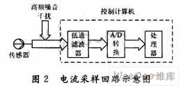 逆變器電路在工作時(shí)會(huì)產(chǎn)生許多高頻電流諧波,這些高頻諧波會(huì)產(chǎn)生高頻電磁場(chǎng),這些空間分布的高頻電磁場(chǎng)會(huì)在采樣電路中產(chǎn)生很多干擾,會(huì)在信號(hào)傳輸線路當(dāng)中產(chǎn)生很多電壓干擾信號(hào),由于導(dǎo)線分布參數(shù)的復(fù)雜和非線性特征。這些干擾的電壓信號(hào)往往體現(xiàn)為噪音信號(hào),噪聲是不能夠被信號(hào)濾波器完整濾除的,通過(guò)低通濾波之后,其截止頻率以下的噪音信號(hào)任然保留,而這些噪音信號(hào)將參與整個(gè)系統(tǒng)的運(yùn)算,最終影響發(fā)出,使得有源電力濾波器的實(shí)際的效果大打折扣。電流采樣回路框圖如圖2所示。