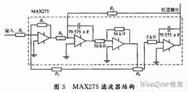 該集成濾波器內(nèi)部含有電容和電阻,中心頻率、品質(zhì)因素和放大倍數(shù)的改變只需改變外圍的R1~R4這四個(gè)電阻就能完成,并且有著很好的相頻特性。MAX275集成濾波器內(nèi)部結(jié)構(gòu)及外部連接如圖3所示,其中虛線框內(nèi)為MAX內(nèi)部部件,外部為需選擇部件。同時(shí)MAX-IM公司針對(duì)MAX275提供了專用設(shè)計(jì)軟件,用戶只需輸入要求,即可獲得相應(yīng)的電阻阻值選擇。