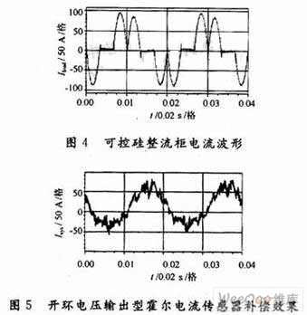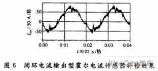 實(shí)驗(yàn)分別對(duì)開(kāi)環(huán)電壓輸出型霍爾電流型傳感器和閉環(huán)電流輸出型霍爾電流傳感器做比較分析,運(yùn)行樣機(jī),得出以下不同的補(bǔ)償效果。圖4為可控硅整流柜開(kāi)啟時(shí)的負(fù)載電流Iload,其中橫坐標(biāo)為時(shí)間,單位為秒,縱坐標(biāo)為電流,單位為安培,可以看出該電流含有大量非基波成分,經(jīng)過(guò)專業(yè)儀器分析,該電流含有大量的5次和7次諧波,這也印證了可控硅電路的諧波含有特點(diǎn)。為樣機(jī)安裝電壓輸出型霍爾電流傳感器,測(cè)量Isys對(duì)可控硅整流柜的補(bǔ)償效果如圖5所示,可見(jiàn)結(jié)果中電流趨于正弦,但仍含有很多毛刺,經(jīng)過(guò)專業(yè)工具分析,發(fā)現(xiàn)電路中雖然5次和7次諧波明顯降低,但是出現(xiàn)了部分偶次諧波,而這些待補(bǔ)償電流中原來(lái)沒(méi)有,說(shuō)明這些電流是由有源濾波器發(fā)出的,而發(fā)出這些電流的原因歸咎于信號(hào)傳遞過(guò)程中的干擾,這些噪聲信號(hào)通過(guò)低通濾波器后仍然留有部分頻率較低信號(hào),參與運(yùn)算后得到了這樣的結(jié)果。