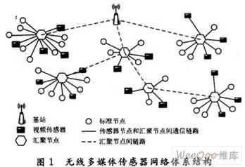無(wú)線多媒體傳感器網(wǎng)絡(luò)(WMSN)是在傳統(tǒng)無(wú)線傳感器網(wǎng)絡(luò)(WSN)基礎(chǔ)上引入了音視頻和圖像等多媒體信息感知功能的一種新型傳感器網(wǎng)絡(luò)。如圖1所示,WMSN通常有大量裝備有CMOS攝像頭和微型麥克風(fēng)的傳感器節(jié)點(diǎn)構(gòu)成,能感知豐富的音頻、視頻、圖像等多媒體信息,實(shí)現(xiàn)紐粒度、精準(zhǔn)信息的環(huán)境監(jiān)測(cè),可廣泛應(yīng)用于戰(zhàn)場(chǎng)可視化監(jiān)控、環(huán)境監(jiān)測(cè)、交通監(jiān)控、智能家居和醫(yī)療衛(wèi)生等領(lǐng)域,因此引起了各國(guó)政府和學(xué)術(shù)界的極大關(guān)注。從2003年起,美國(guó)計(jì)算機(jī)協(xié)會(huì)專門組織國(guó)際視頻監(jiān)控與傳感器網(wǎng)絡(luò)研討交流相關(guān)研究成果,加州大學(xué)和斯坦福大學(xué)等美國(guó)多所著名學(xué)府都開(kāi)始了WMSN的研究工作。我國(guó)高校和研究機(jī)構(gòu)也開(kāi)始了該領(lǐng)域的探索,但研究成果尚處于起步階段,距離實(shí)際需求還相差甚遠(yuǎn)。