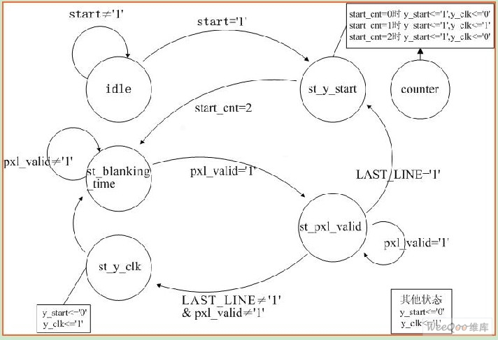 本系統(tǒng)時(shí)序采用VHDL硬件描述語言設(shè)計(jì),其核心部分為一個(gè)有限狀態(tài)機(jī),具體狀態(tài)關(guān)系如下