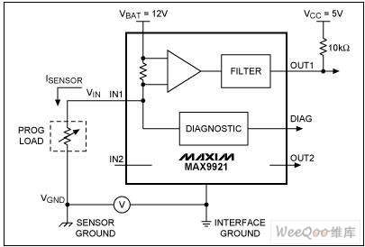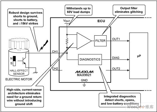 MAX9921較高的地電位差承受力、輸入保護電路、高達60V的耐壓以及診斷功能使得MAX9921成為汽車、工業(yè)等惡劣環(huán)境下霍耳傳感器與微控制器接口的理想選擇,提供完備、可靠的集成方案。