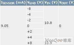 在第一個試驗中,流入可編程負載的電流置為9.05mA,比MAX9921輸出從低電平(~0V)切換到高電平(~5V,上拉電阻接5V)的閾值低50?A。通過直流電壓發(fā)生器(V),可編程負載地電位與MAX9921地電位的差。如表1所示,VBAT = 12V,MAX9921的門限能夠承受高達±8V的地電位差!