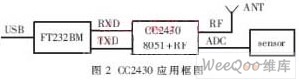 目前,常見的Zigbee無線傳感器平臺都是由一個8位或16位的單片機(jī)和Zigbee射頻芯片組成。隨著芯片設(shè)計的發(fā)展,目前出現(xiàn)了無線單片機(jī),即將處理器模塊和射頻模塊集成在同一個芯片中。Ti-Chipcon公司的CC2430就是其中的代表,其典型應(yīng)用如圖2所示。