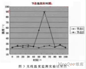 只要在該平臺的基礎(chǔ)上設(shè)計應(yīng)用層的程序就能實現(xiàn)無線溫度監(jiān)測,無需設(shè)計物理層、MAC層和網(wǎng)絡(luò)層的代碼。每隔10秒進(jìn)行一次溫度采集,兩次溫度采集期間節(jié)點進(jìn)入休眠狀態(tài),以減少功耗。某一時刻對節(jié)點1加熱,從圖3可以看出,在60秒左右時,采集的數(shù)據(jù)明顯地增大。而節(jié)點2在時刻采集環(huán)境溫度,可以看出,采集到的數(shù)據(jù)基本為一直線。實驗結(jié)果表明,該溫度監(jiān)控可以很好地實現(xiàn)功能,而且具有低功耗、低速率的特點,布置起來擺脫了線纜的限制。