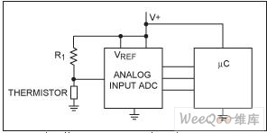 圖1. 在這個簡單接口中,ADC的基準(zhǔn)電壓取自電源電壓?捎媚M溫度傳感器取代熱敏電阻-電阻分壓器。在此情況下,ADC (有可能內(nèi)置于IC)需要一個足夠精度的電壓基準(zhǔn)。