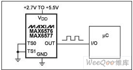 圖2. MAX6576輸出方波的周期正比于絕對溫度,MAX6577的輸出頻率正比于絕對溫度。比例常數(shù)通過TS0和TS1引腳在四種值中選擇其一,無需外圍元件。