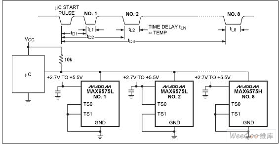 圖3. 采用延時方式編碼溫度信息,最多至8片MAX6575可通過一個數(shù)字I/O引腳將8個溫度信息傳送給μC。