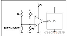用一個電壓比較器取代圖1中的ADC,產(chǎn)生的1位輸出可驅(qū)動IC的一個I/O引腳(圖4)。同樣,圖中的熱敏電阻也可以由模擬電壓輸出的溫度傳感器代替。大多數(shù)此類器件的輸出電壓與溫度的關(guān)系與電源電壓無關(guān)。為避免電源電壓變化的影響,將比較器的電阻分壓器頂端連接至電壓基準(zhǔn)而非電源電壓。