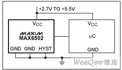 如果將傳感器-比較器組合電路替換為溫度開關(guān),如MAX6501,則系統(tǒng)得到進(jìn)一步簡化。這種單片器件結(jié)合了傳感器、比較器、電壓基準(zhǔn)和外部電阻等多種功能。當(dāng)溫度超過預(yù)設(shè)門限時,漏極開路輸出變低。該系列中還有一些器件在溫度低于設(shè)定門限時開漏輸出變低(MAX6503),另外一些為推/挽式輸出,在溫度高于或低于設(shè)定門限時輸出變高(MAX6502,圖5,或MAX6504)。此外,通過一個引腳接V+或接地,可設(shè)置2°C或10°C的滯回。現(xiàn)有的門限溫度介于-45°C至+115°C之間,間隔10°C。