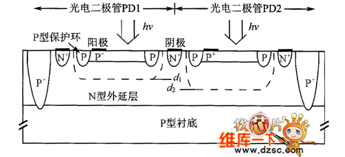 P+-N型光電二極管采用在電阻率p=6Ω·cm的N型外延層上注入硼形成。光電二極管的P+陽極被輕摻雜的P型擴散保護環(huán)包圍,其作用是提高P+-N結的反向擊穿電壓。對于彩色傳感器來說,應用時需要在兩個結構完全相同的光電二極管上分別加上不同的反向偏壓。以使得它們的空間電荷區(qū)寬度有所差異,如圖1所示中的d1和d2。彩色傳感器的具體工作機理相當復雜。我們假設硅對藍色光的吸收深度小于d1,這樣,當入射光功率相同時,兩個探測器產(chǎn)生的光電流也將是完全一樣的。而對于波長較長紅光來說,其吸收深度要大于藍光,我們假設其吸收深度大于dg,即有部分入射深度大于dy的光對光電流的產(chǎn)生不起作用,這樣,空間電荷區(qū)較寬的探測器產(chǎn)生的光電流也較大。通過變化探測器的反向偏壓,就可以實現(xiàn)調(diào)節(jié)吸收波長下限的目的,這樣就可以確定吸收單色光的波長了。實際應用中,對光電流及它們之差與探測器反向掃描電壓之間關系的分析都是通過雙極型的電子電路來實現(xiàn)的。這種OEIC提供了一個與入射光功率分布的平均值成正比的電壓值,此部分入射光是限制在光譜的電可調(diào)節(jié)部分的[42]。還需要提到的是,在這種彩色傳感器中,載流子壽命和擴散長度不可能太大。在空間電荷區(qū)深度餳之下的N型外延層部分產(chǎn)生的光生載流子向耗盡區(qū)的擴散將會被阻止,因為P型襯底和N型外延層之間反偏的pn結會將這些載流子全部收集。