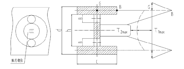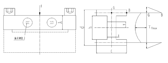 從圖(2)的分析中得知,在y接近“0”的地方,產(chǎn)生的剪切應(yīng)力τ越接近其最大值τmax,我們是否可以只要產(chǎn)生剪切應(yīng)力峰值的局部區(qū)域,而去除其余的部分?紤]到應(yīng)變計(jì)貼片所需的尺寸和彈性體加工的方便,沿著傳感器的載荷方向鉆通孔2-ΦB(圖4),經(jīng)過(guò)簡(jiǎn)單的應(yīng)力分布分析(圖4,其中虛線為方案二中應(yīng)力曲線),應(yīng)力不但最大應(yīng)力值τ2max比τ1max也有了大幅度增加,而且對(duì)于更加集中。