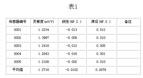 從表中5只傳感器的測(cè)試結(jié)果來(lái)看,平均靈敏度1.2718mV/V,一致性比較好,但與設(shè)計(jì)計(jì)算要求的2mV/V的靈敏度相差甚遠(yuǎn);而且線性和滯后指標(biāo)都具有良好的一致性。