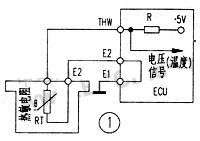 進(jìn)氣溫度傳感器的安裝位置有 3 種:在 D 型 EFI 系統(tǒng)中,它安裝在空氣濾清器之后的進(jìn)氣軟管上;在 L 型 EFI 系統(tǒng)中,它安裝在空氣流量傳感器上;有的進(jìn)氣溫度傳感器安裝在進(jìn)氣壓力傳感器內(nèi)。進(jìn)氣溫度傳感器內(nèi)部,也是一個具有負(fù)溫度電阻系數(shù)的熱敏電阻.外部用環(huán)氧樹脂密封。進(jìn)氣溫度傳感器與 ECU 的連接電路如圖 2 所示。
