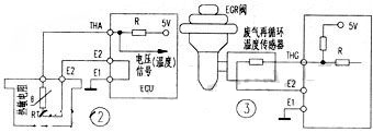 (2) 測量輸入。信號電壓。將點(diǎn)火開關(guān)置于 ON 位置,用萬用表的電壓擋測量圖中 ECU 的 THA 與 E2 間的電壓,該電壓值應(yīng)在 0 . 5 ~ 3 . 4V( 20 ℃ ) 范圍內(nèi)。若不在規(guī)定范圍內(nèi),則應(yīng)進(jìn)一步檢查進(jìn)氣溫度傳感器連接線路是否接觸不良或存在斷路、短路故障。 (3) 檢查進(jìn)氣溫度傳感器連接線束電阻。用數(shù)字式萬用表的電阻擋測量傳感器插頭與 ECU 插接器端子間電阻,即傳感器信號端、地線端分別與對應(yīng)的 ECU 的兩端子電阻。如果不導(dǎo)通或電阻值大于 1 Ω,說明傳感器連接線路或插頭接觸不良,應(yīng)進(jìn)一步撿查。