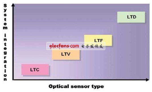 LTV和LTC器件分別將光能轉(zhuǎn)換成電壓和電流輸出。這兩種器件有許多相同的應(yīng)用并可以交互使用。所以,請記住,在下面有關(guān)LTV器件的討論中,如果你使用電流替換電壓,那么討論結(jié)果也將適用于LTC器件。LTV器件在感應(yīng)到光的強(qiáng)度時(shí),它的輸出電壓會(huì)增大或減小。器件的動(dòng)態(tài)范圍是介于最小和最大輸出電壓之間的范圍。最小的電壓等級/輸出稱為暗電壓(Vd),出現(xiàn)在輸入光強(qiáng)度為0的時(shí)候。最大或飽和電壓級別對應(yīng)于光電二極管能夠轉(zhuǎn)換的最大光能量的輸入;即使光能量輸入超過該值,輸出電壓仍將保持不變!TV/C探測器適用于需要監(jiān)測光強(qiáng)瞬間變化的應(yīng)用領(lǐng)域,例如,在某條生產(chǎn)線上,有必要檢測快速移動(dòng)的傳送帶上每個(gè)物體經(jīng)過某一點(diǎn)時(shí)光強(qiáng)的變化。通常,需要安裝一個(gè)A/D轉(zhuǎn)換器,作為傳感器和微處理器或其他類型控制器之間的接口。LTF器件將光能轉(zhuǎn)換成某種波形,波形的頻率與被感應(yīng)的光強(qiáng)成正比。LTF器件的動(dòng)態(tài)范圍由它的最小和最大輸出頻率決定。當(dāng)輸入光強(qiáng)為0時(shí),輸出是最小頻率或暗頻率。而最大或滿刻度頻率是輸出頻率不再隨著光強(qiáng)的增加而增加時(shí)的頻率。