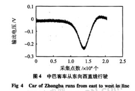 通過直線法和圓周法對不同目標(三菱汽車和中巴客車)進行了信號采集,采樣率為3 k。在直線法采集中,目標與傳感器的距離為4m,且三菱車的行駛速度為20km/h,中巴為14 km,/h。圖3、圖5是對三菱車信號采集的結(jié)果,圖4是對中巴客車信號采集的結(jié)果。