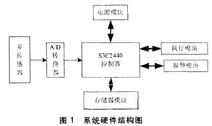 本方案硬件系統(tǒng)的核心控制器是采用三星的具有ARM920T核的16/32位多功能、低功耗的嵌入式處理器S3C2440。S3C2440是韓國(guó)三星公司推出的一款高檔的,可用于工業(yè)控制、智能家電等便攜產(chǎn)品開(kāi)發(fā)的嵌入式微處理器,其主頻處理速度達(dá)到400MHz,完全可以滿足火災(zāi)監(jiān)控報(bào)警的實(shí)時(shí)性處理要求。其主控制芯片及豐富的外圍接口電路可用于連接各類數(shù)字設(shè)備從而實(shí)現(xiàn)數(shù)據(jù)交換;诙傳感器數(shù)據(jù)融合的火災(zāi)預(yù)警系統(tǒng)采用模塊化結(jié)構(gòu),主要由傳感器模塊、 A/D轉(zhuǎn)換模塊、S3C2440控制器、報(bào)警模塊、執(zhí)行模塊和控制器必需的電源模塊和存儲(chǔ)器模塊組成,圖1為系統(tǒng)結(jié)構(gòu)圖。