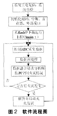該系統(tǒng)的軟件部分主要包括系統(tǒng)的上電初始化、系統(tǒng)自檢、初始化時(shí)鐘、中斷設(shè)置、外設(shè)初始化,然后運(yùn)行主程序main()函數(shù),建立任務(wù)后,擴(kuò)展口對(duì)ADC進(jìn)行控制切換通道采集數(shù)據(jù)。對(duì)數(shù)據(jù)進(jìn)行平滑濾波、標(biāo)定補(bǔ)償?shù)阮A(yù)處理后,來(lái)通過(guò)數(shù)據(jù)融合算法分析火災(zāi)發(fā)生情況,判斷是否報(bào)警并循環(huán)檢測(cè)。系統(tǒng)軟件流程如圖2所示。